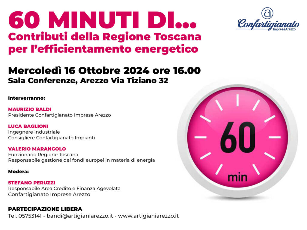 Confartigianato Imprese Arezzo ha promosso un nuovo appuntamento dal titolo “60 Minuti di…Contributi della Regione Toscana per l’efficientamento energetico”, che si terrà Mercoledì 16 Ottobre 2024 alle ore 16.00 presso la Sala Conferenze in Via Tiziano 32, Arezzo.