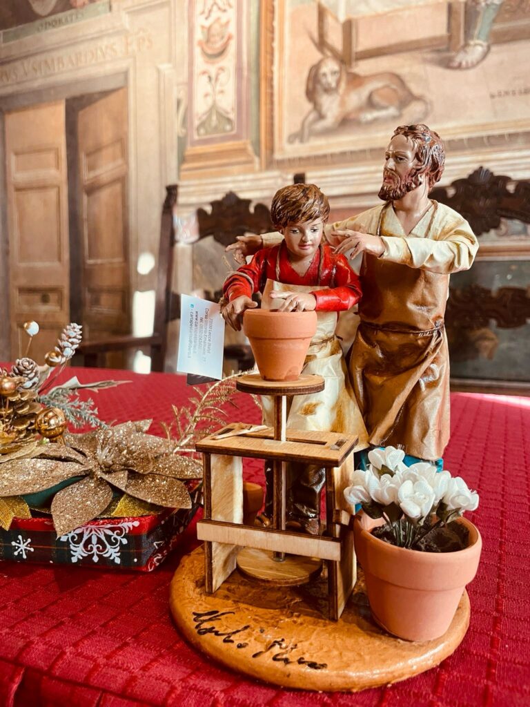 Nel 2020 la statuina rappresentava un’infermiera, nel 2021 un imprenditore digitale, nel 2022 una florovivaista, quest’anno la statuina rappresenta attraverso un maestro imprenditore e il suo apprendista la trasmissione del saper fare attraverso le generazioni.