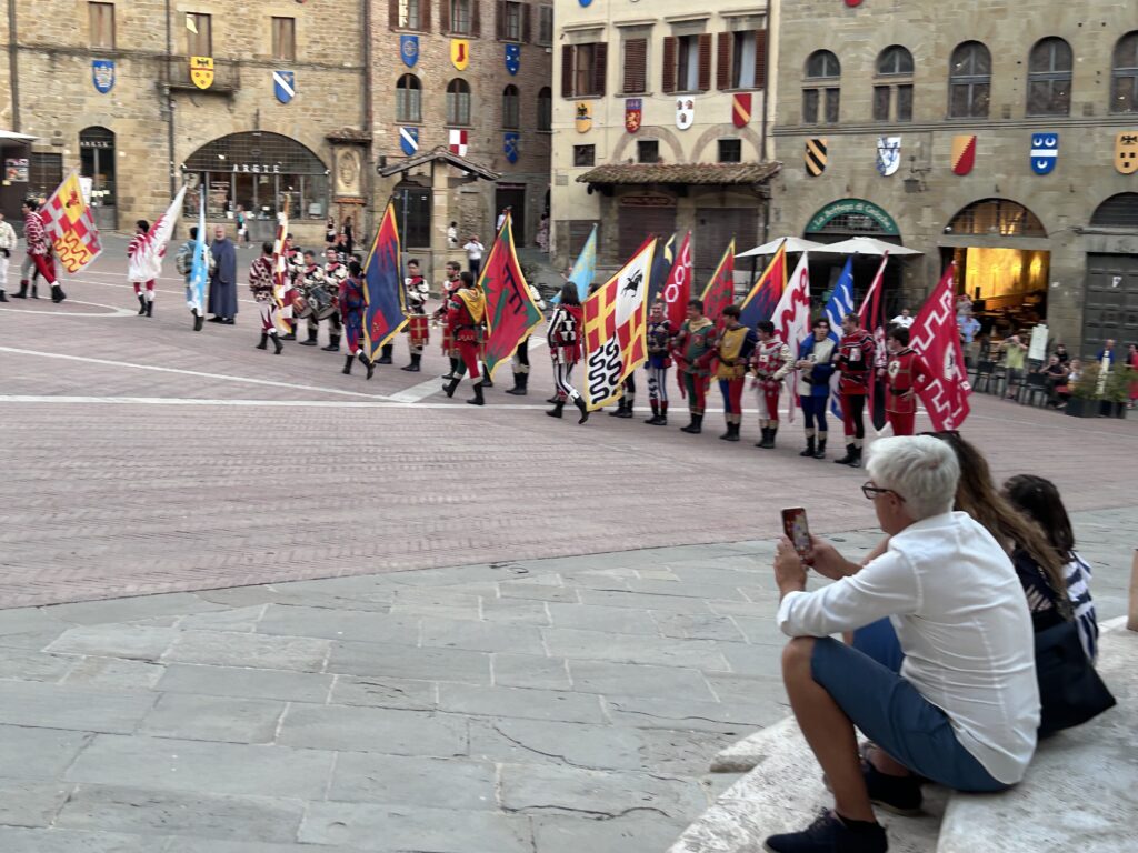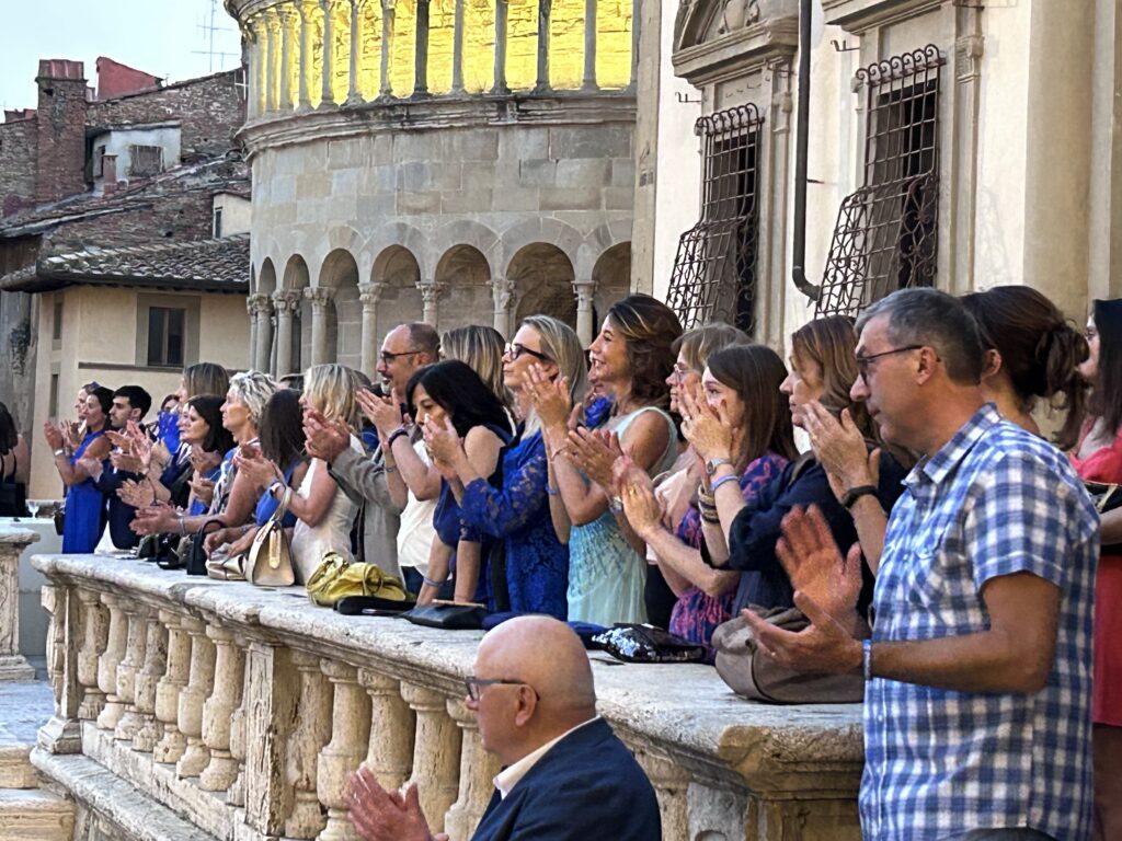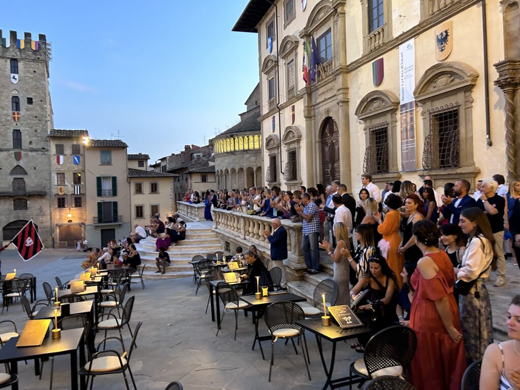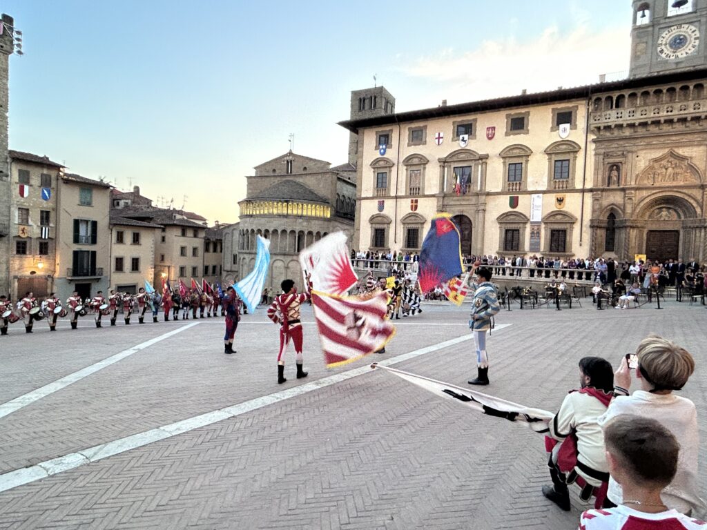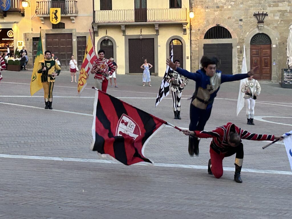La serata è stata allietata anche dallo straordinario spettacolo degli Sbandieratori di Arezzo che hanno voluto a loro modo omaggiare i vertici di Confartigianato presenti in Piazza Grande.