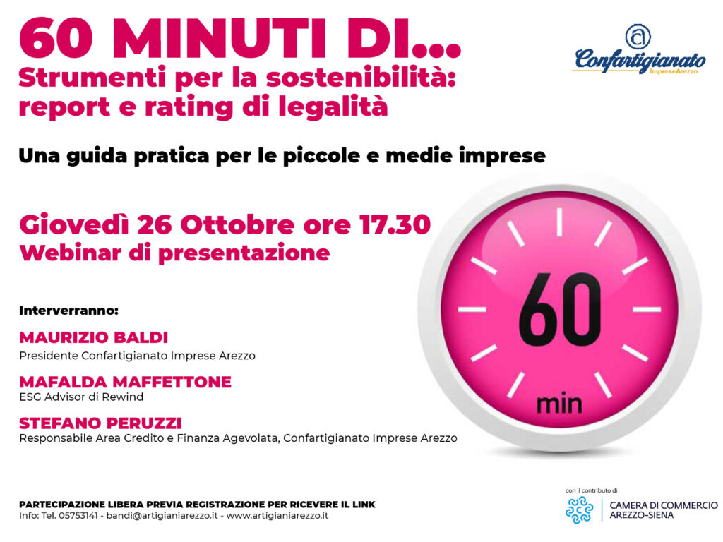 Al fine di concentrarsi sulle ultime tendenze e best practice in materia di sostenibilità e legalità, abbiamo promosso, grazie al contributo della Camera di Commercio di Arezzo Siena, nell’ambito della nostra Settimana per l’Energia e Sostenibilità un nuovo incontro del nostro format online “60 minuti di…” dal titolo “60 minuti di…Strumenti per la sostenibilità: report e rating di legalità. Una guida pratica per le PMI”