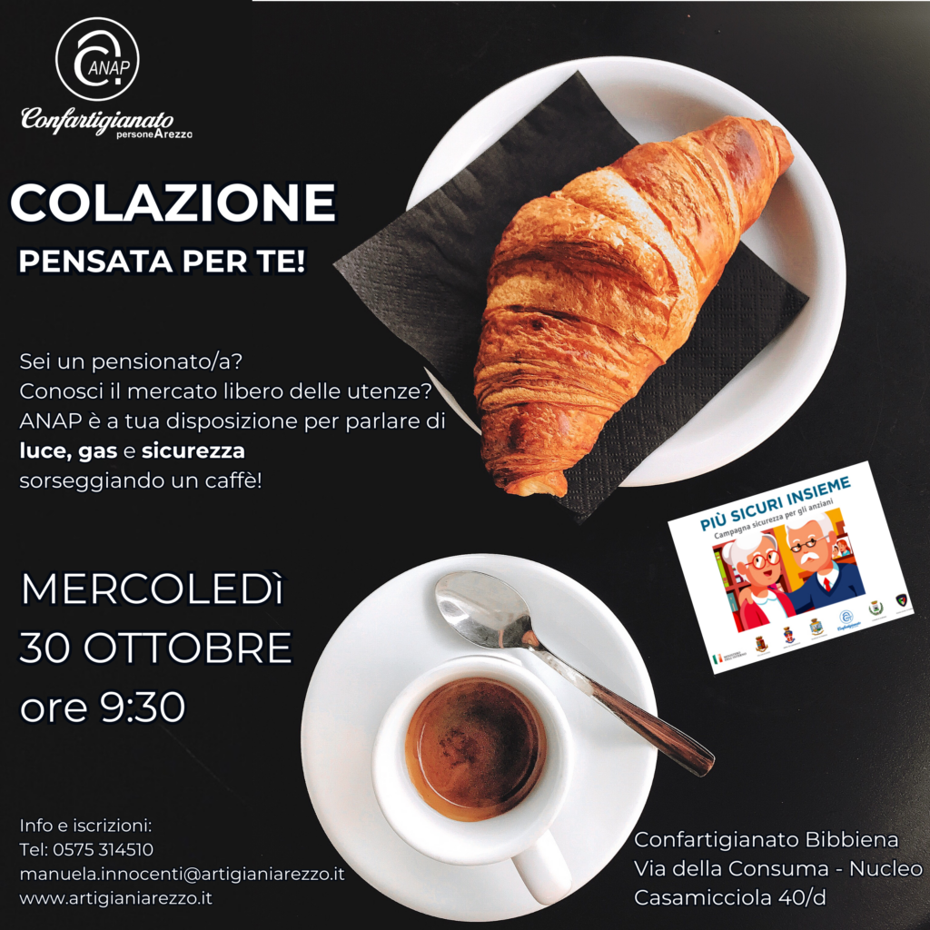 ANAP Confartigianato Arezzo (il nostro sindacato che rappresenta, tutela e difende anziani e pensionati), organizza per Mercoledì 30 Ottobre dalle ore 9.30, presso la sede di Confartigianato Bibbiena in Loc. Nucleo Casamicciola 40/D, un nuovo incontro dal titolo “COLAZIONE PENSATA PER TE!”.