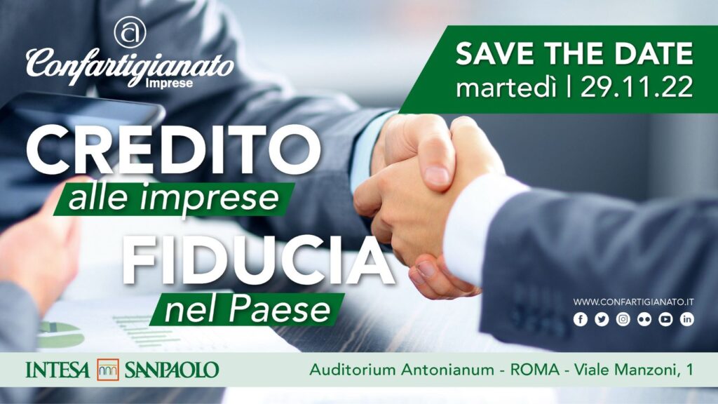 Martedì 29 Novembre 2022 dalle ore 9.30 alle ore 17.00, l’Auditorium Antonianum di Roma ospita l’evento “Credito alle imprese, fiducia nel Paese”, organizzato da Confartigianato in collaborazione con Intesa Sanpaolo per approfondire le politiche del credito e gli strumenti a disposizione di artigiani e piccoli imprenditori.