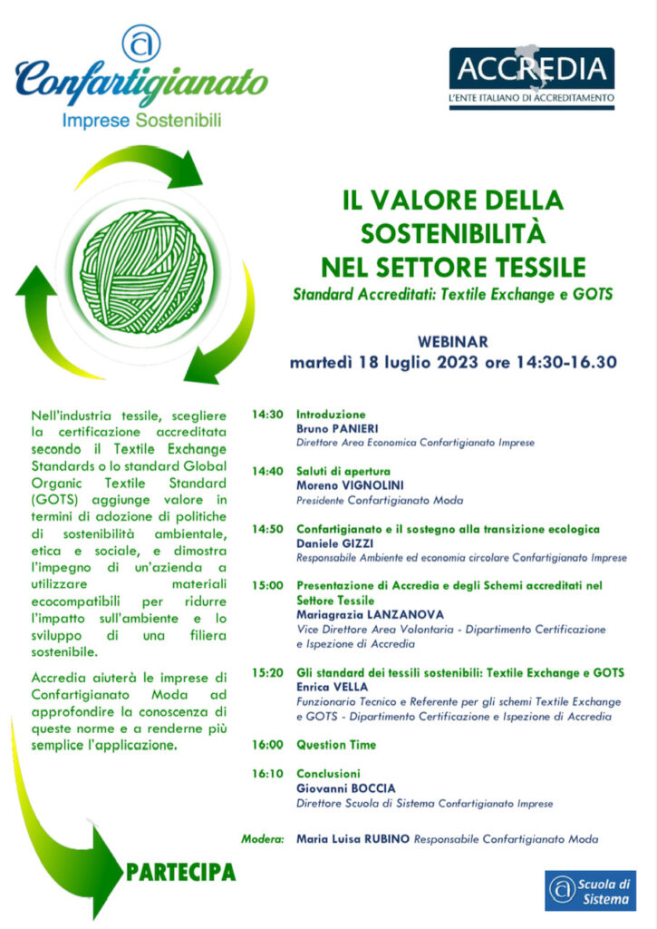 A questo proposito, Martedì 18 Luglio dalle ore 14.30 alle ore 16.30 è in programma un webinar gratuito dal titolo ‘Il valore della sostenibilità nel settore tessile’ in partnership con Accredia (l’ente italiano di accreditamento).