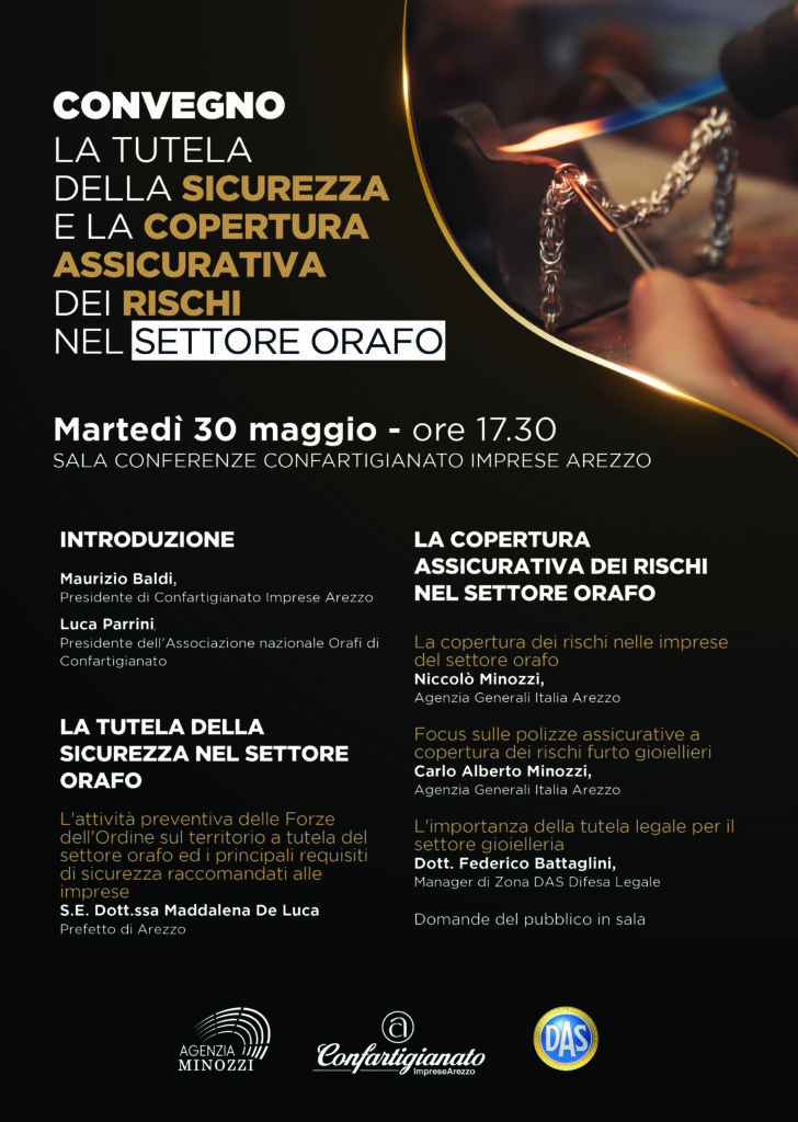 La seconda parte del convegno sarà sviluppata in collaborazione con l’Agenzia Assicurativa Generali Minozzi di Arezzo e sarà dedicata al tema della copertura dei rischi assicurativi per le imprese del settore orafo.