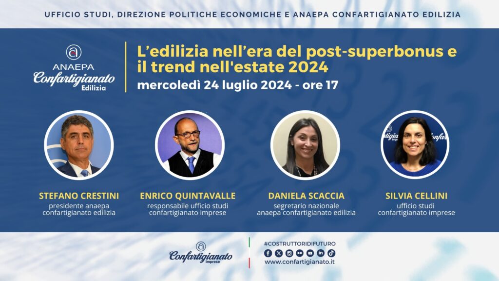 Mercoledì 24 luglio dalle ore 17.00 alle 19.00, ANAEPA-Confartigianato Edilizia e l’Ufficio di Studi di Confartigianato Imprese, nell’ambito delle sessioni di formazione streaming 2024 della Scuola di Sistema, organizzano il webinar dal titolo “L’edilizia nell’era del post-superbonus e il trend nell’estate 2024”.