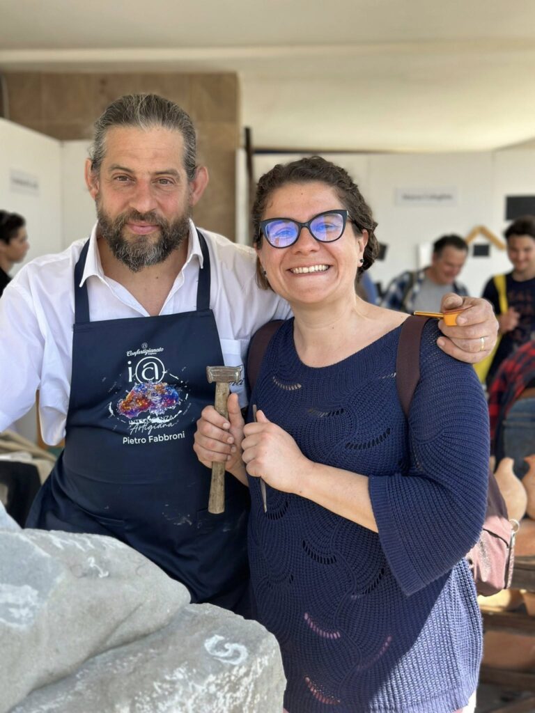 Pietro Fabbroni darà una dimostrazione della scultura del materiale lapideo. La “Bottega dello Scalpellino” di Pietro Fabbroni si trova nel comune di Terranuova Bracciolini, lungo la strada del Pian di Loro, in provincia di Arezzo. Erede della decennale tradizione familiare della bottega d’arte “BIRI”, avviata dal padre Paolo, Pietro Fabbroni si dedica con passione alla lavorazione del materiale lapideo. Si occupa di restauro conservativo, progettazione, realizzazione e messa in opera di elementi architettonici, manufatti e complementi d’arredo per interni ed esterni come ad esempio sculture, soglie, caminetti, scale e portali. Un’abilità manuale la sua che dalla pietra serena e al marmo si trasferisce all’occorrenza anche al ferro ed al legno per la realizzazione di oggetti unici che coniugano maestrìa artigianale ed estro creativo e gli vengono commissionati da una vasta clientela italiana ed internazionale.