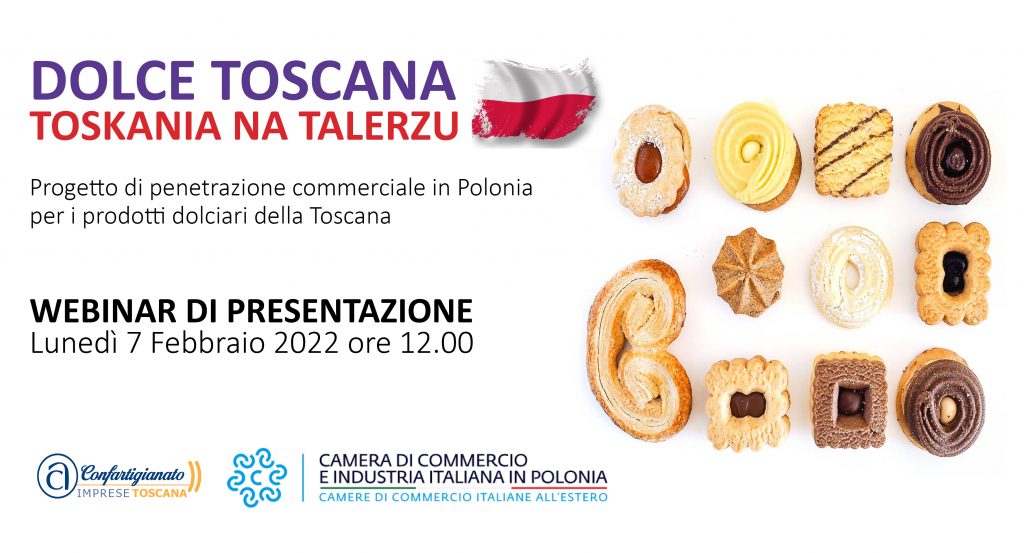 Lunedì 7 Febbraio 2022 dalle ore 12.00 alle ore 13.00 il webinar di presentazione "Dolce Toscana - Toskania na talerzu" promosso da Confartigianato Toscana e Camera di Commercio Italiana in Polonia