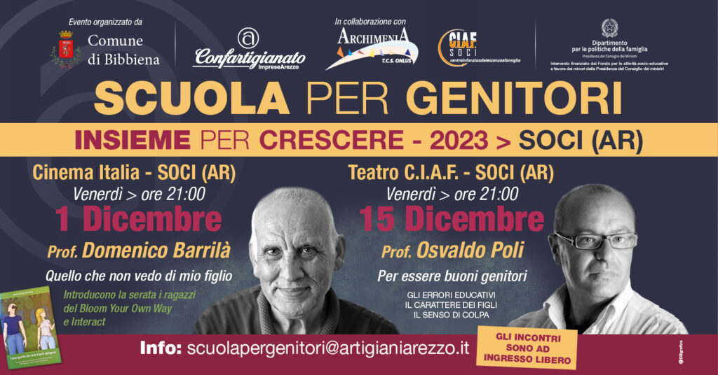 - Venerdì 15 Dicembre 2023 alle ore 21.00 presso il Teatro CIAF di Soci con l’intervento del Prof. Osvaldo Poli dal titolo “Per essere buoni genitori” con un focus sul concetto di essere “buoni” genitori: errori e sensi di colpa.