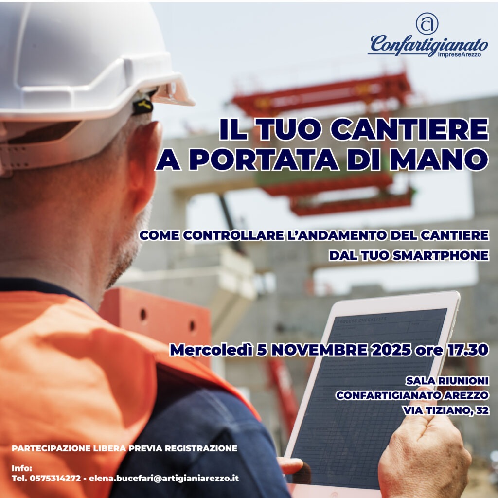 E’ questo il tema dell’evento “Il tuo cantiere a portata di mano” in programma Martedì 5 Novembre 2025 alle ore 17.30. La partecipazione è in modalità mista: in presenza (Sala Eventi Via Tiziano 32 Arezzo) o tramite piattaforma on line condivisa.