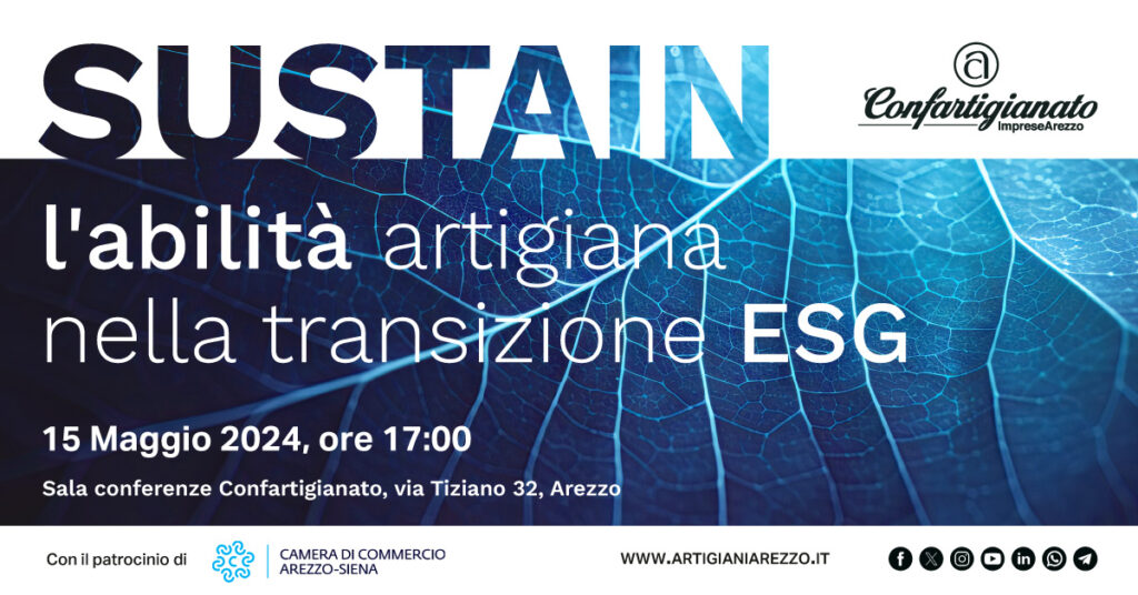“Sustain, l’abilità artigiana nella transizione ESG“ è il titolo dell’incontro promosso da Confartigianato Imprese Arezzo in programma Mercoledì 15 Maggio 2024 alle ore 17.00 presso la sede provinciale di Via Tiziano 32.