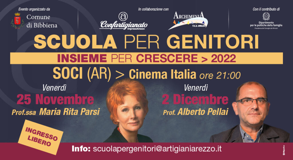 Dopo 2 anni di stop causati dalla pandemia, grazie all’impegno del Comune di Bibbiena, dell’Associazione Archimenia e con il contributo del Ministero per le politiche della famiglia, i genitori torneranno in aula grazie alla presenza di due eccezionali relatori: la Professoressa Maria Luisa Parsi e il Professor Alberto Pellai.