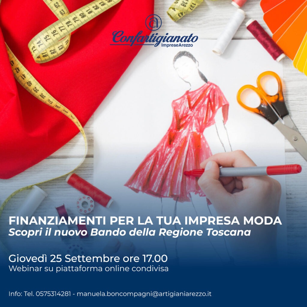 Per ricevere ulteriori informazioni e il link di accesso all’evento è necessario contattare la Coordinatrice di Confartigianato Moda, Manuela Boncompagni (Tel. 0575314281 – manuela.boncompagni@artigianiarezzo.it).
