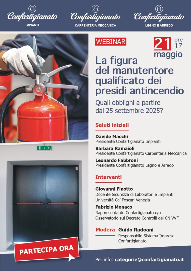 Mercoledì 21 Maggio alle ore 17.00, Confartigianato promuove un webinar informativo dal titolo “La figura del manutentore qualificato dei presidi antincendio. Quali obblighi a partire dal 25 Settembre 2025?”.