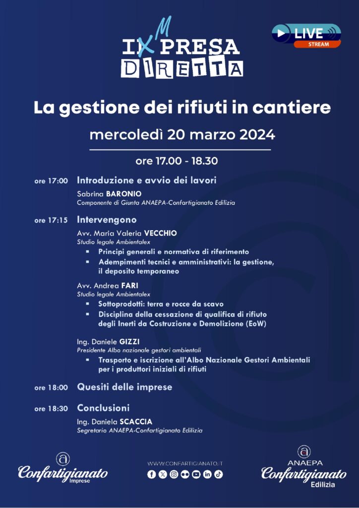 L’evento online del ciclo “IMPRESA DIRETTA” dal titolo “La gestione dei rifiuti in cantiere” si terrà Mercoledì 20 Marzo dalle ore 17.00 alle ore 18.30.