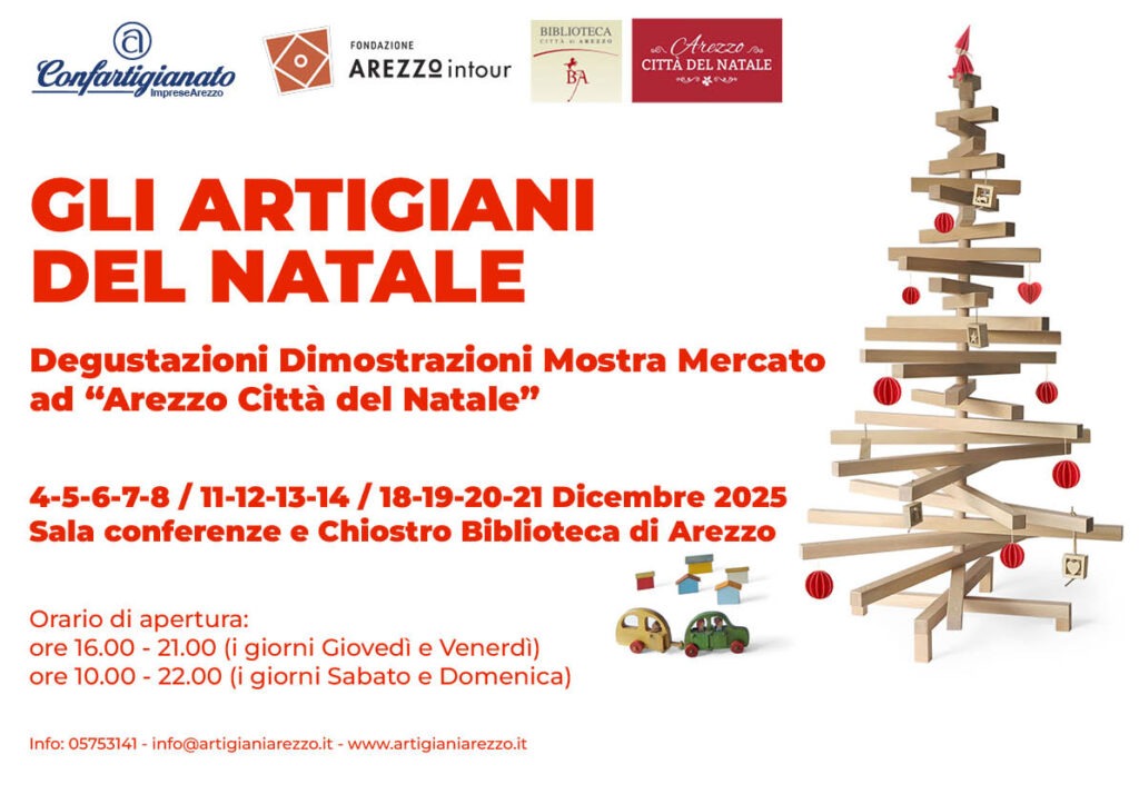 Arezzo Città del Natale, promossa in collaborazione con Fondazione Arezzo Intour, Comune di Arezzo, Discover Arezzo e Biblioteca Città di Arezzo, darà anche quest’anno visibilità alle eccellenze artigiane, cuore pulsante dell’identità aretina, grazie alla mostra mercato “Gli Artigiani del Natale”, che aprirà i battenti il Giovedì 4 Dicembre all’interno del chiostro della Biblioteca Comunale.