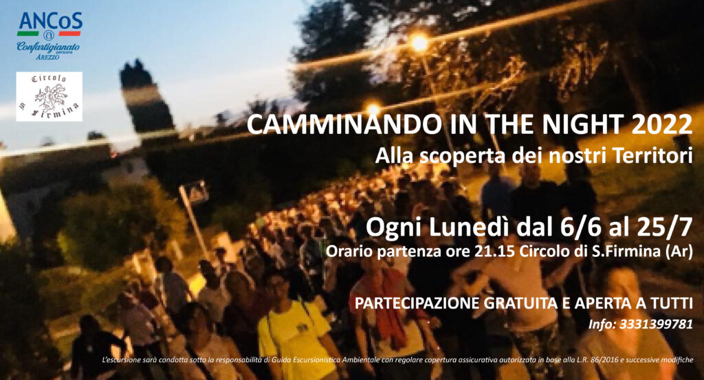 Le camminate si terranno ogni Lunedì fino al 25 Luglio 2022 con partenza dal Circolo di Santa Firmina fissata per le ore 21.15 circa