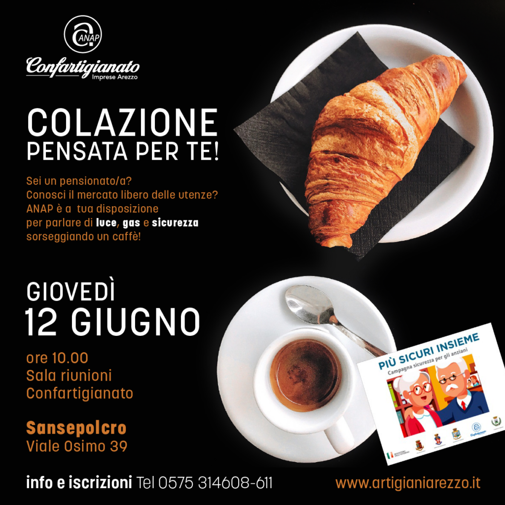 ANAP Confartigianato Arezzo (il nostro sindacato che rappresenta, tutela e difende anziani e pensionati), organizza per Giovedì 12 Giugno dalle ore 9.30, presso la sede di Confartigianato Sansepolcro Viale Osimo 39, un nuovo incontro dal titolo “COLAZIONE PENSATA PER TE!”.