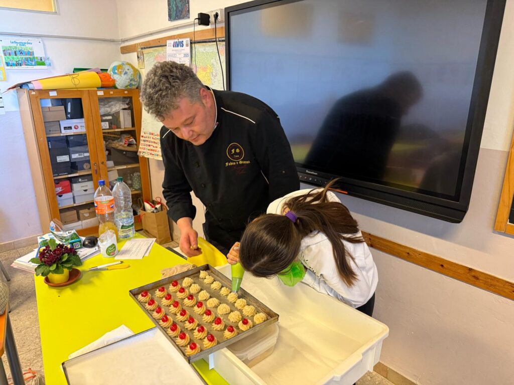I nostri Renzo Francini e Fabio Bardelli con gli studenti di Lucignano sui segreti della pasticceria e creazione oggetti da scarti di falegnameria