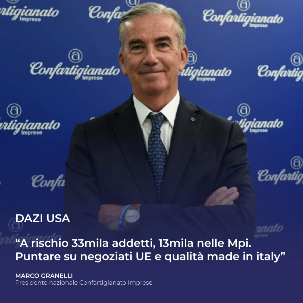 “La politica dei dazi – sottolinea il Presidente di Confartigianato Marco Granelli – non paga per nessuno. Le sfide commerciali si vincono garantendo la libera circolazione delle merci. Vanno sostenuti i processi di negoziazione in ambito europeo per evitare una escalation della guerra commerciale, mettendo in gioco gli acquisti dagli Usa di energia, di prodotti per la difesa e di servizi digitali. E le nostre imprese devono intensificare gli sforzi per assicurare l’alta qualità della manifattura made in Italy, arma vincente e distintiva che i mercati sanno riconoscere ed apprezzare. E’ fondamentale muoversi come Sistema Paese, con un impegno deciso da parte del Governo e delle istituzioni a sostegno delle aziende e della competitività dei nostri prodotti, diversificando i mercati sui quali accompagnare le nostre imprese, soprattutto quelle di piccole dimensioni che si sono già dimostrate capaci di vendere i loro prodotti in molti paesi del mondo”.
