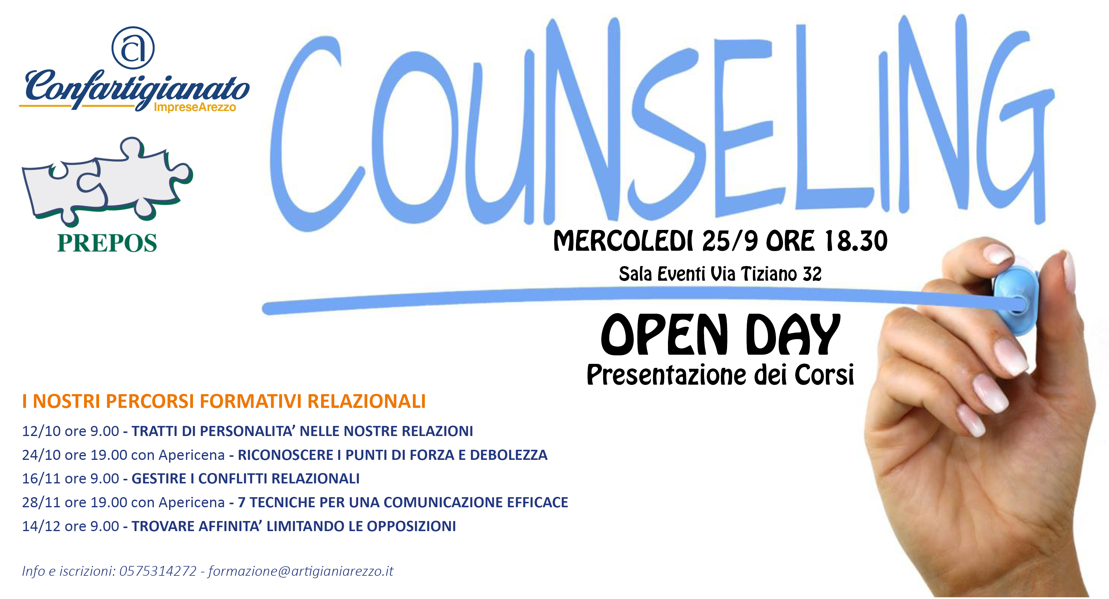 Per conoscere i percorsi formativi che saranno sviluppati con la metodologia del counseling relazionale e per avere altre informazioni sull’open day è possibile contattare Elena Bucefari o Marco Bacci (Tel. 0575314272 – formazione@artigianiarezzo.it)