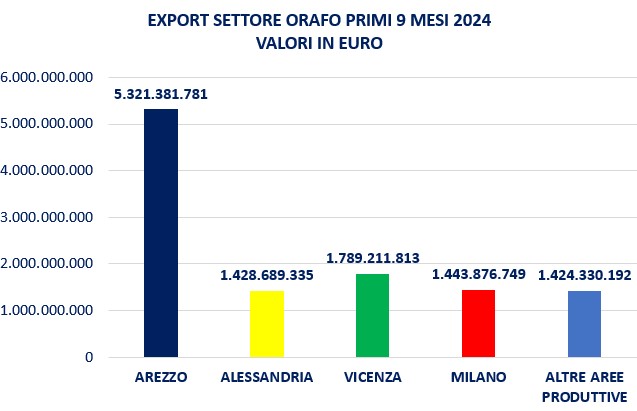Quasi la metà dell’export italiano di settore (47%) viene prodotto nel distretto di Arezzo che ha avuto nel corso del 2024 una crescita del 119% per effetto dell’impennata delle esportazioni verso la Turchia. Tale crescita è riconducibile essenzialmente alla tassazione del metallo prezioso decisa dal governo Erdogan che rende più conveniente per le imprese turche l’acquisto di oreficeria dall’estero in alternativa all’acquisto di materia prima da destinare alla lavorazione.