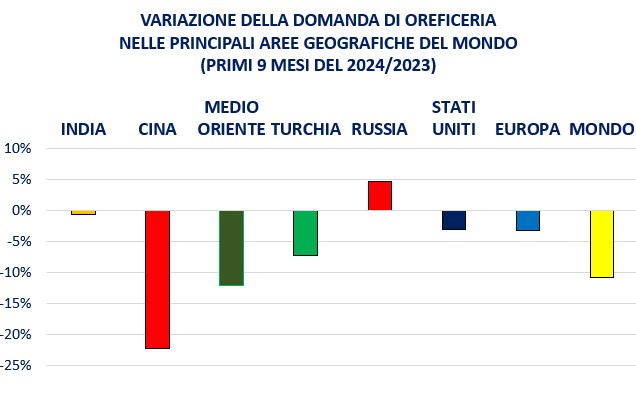 “La contrazione della domanda internazionale – continua Frusone – è riconducibile in larga parte all’aumento del prezzo dell’oro, cresciuto del +18,4% rispetto al 2023. La minore propensione all’acquisto da parte dei consumatori nei diversi paesi del mondo è inoltre riconducibile al peggioramento del clima di fiducia prodotto dalle guerre in Europa orientale ed in Medio-Oriente, al persistere delle pressioni inflazionistiche negli Stati Uniti oltre che al rallentamento della crescita economica in Cina ed in Europa”.