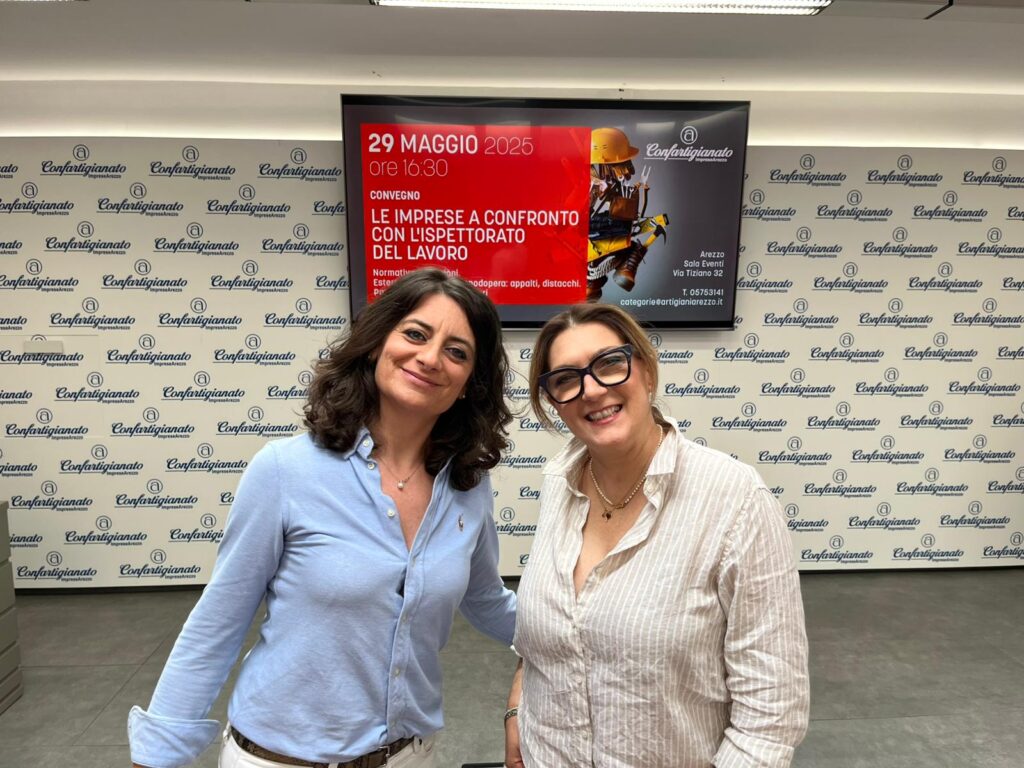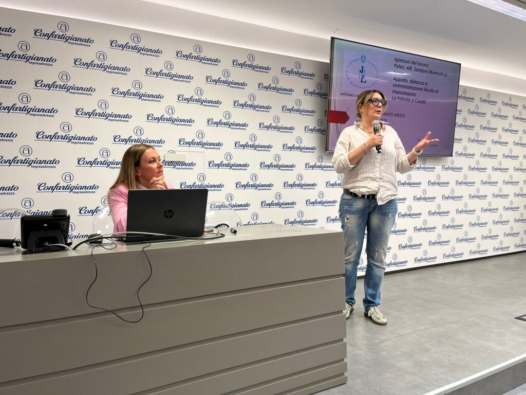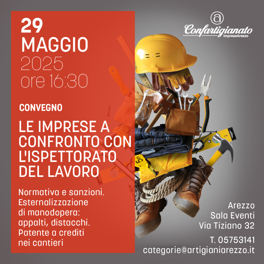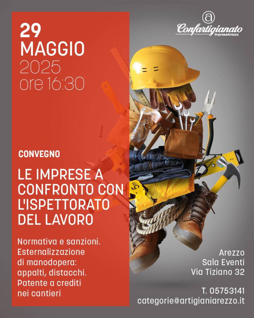Giovedì 29 Maggio 2025 alle 16.30 presso la Sala Eventi di Via Tiziano 32 ad Arezzo, si terrà il momento informativo con gli interventi della Dr.ssa Angela Menci, Responsabile Processo Vigilanza e della Dr.ssa Laura Rossi, Ispettore del Lavoro. Ad introdurre i lavori saranno la Dr.ssa Dina Musio, Direttore ITL Arezzo e la Dr.ssa Martina Grazzini, Responsabile Provinciale Gestione del Personale di Confartigianato Arezzo.