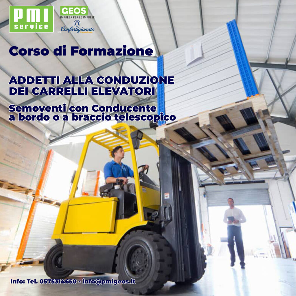 PMI Service srl, Società del sistema Confartigianato Arezzo organizza Corsi di formazione per la conduzione di carrelli elevatori (semoventi con conducente a bordo o a braccio telescopico).