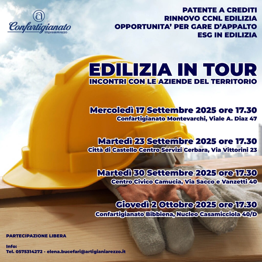 Confartigianato Edilizia, organizza una serie di incontri nel territorio con le imprese del comparto edile per approfondire alcune tematiche di grande importanza che interessano il settore quali appunto Patente a crediti, Rinnovo CCNL Edilizia e opportunità per gare d’appalto ed ESG in edilizia.