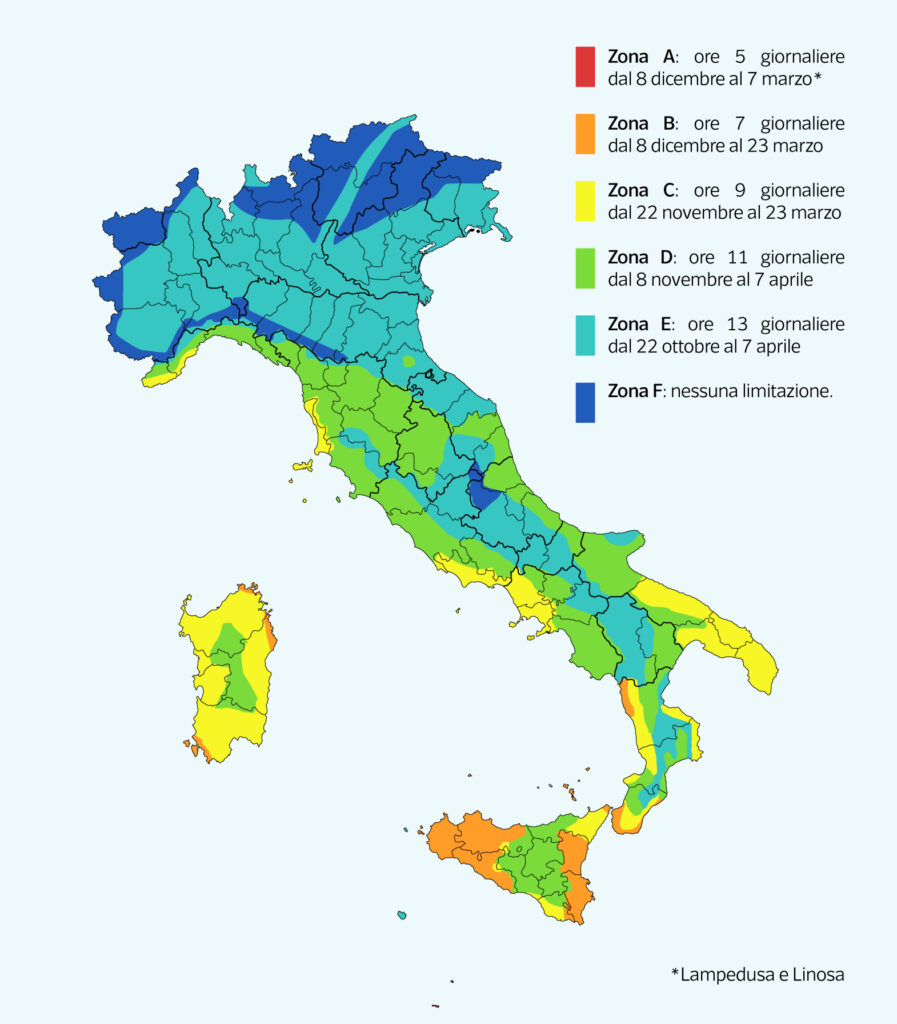 La maggior parte della Toscana rientra nella zona climatica D, dove gli impianti si potranno accendere dall’8 novembre 2022 al 7 aprile 2023 per un massimo di 11 ore giornaliere.
