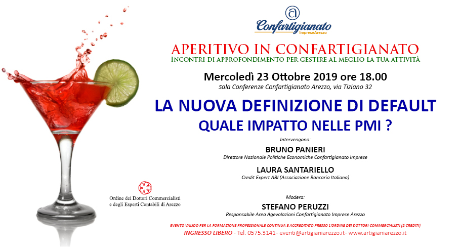 La nuova definizione di default. Quale impatto nelle PMI ? è il tema del prossimo Aperitivo in Confartigianato che si terrà Mercoledì 23 Ottobre 2019 alle ore 18.00 presso la Sala Eventi di Confartigianato Imprese Arezzo in via Tiziano 32.
