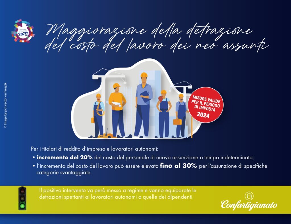 Arriva la maxi deduzione per le assunzioni a tempo indeterminato, che sale ulteriormente per mamme o donne disoccupate, giovani ed ex beneficiari del Reddito di cittadinanza fino a toccare il 130%. Confermata la detassazione dei premi produttività al 5%, mentre cambia la soglia di esenzione dei fringe benefit, che si potranno usare anche per pagare affitto e mutuo prima casa: sale a 1.000 euro per tutti e scende a 2 mila per i lavoratori con figli – GUARDA QUI LA NOSTRA NEWS DI APPROFONDIMENTO