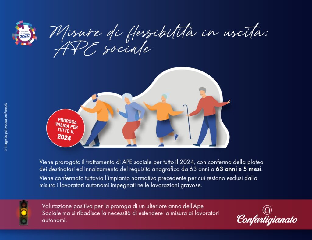 L’Ape Sociale viene prorogata fino al 31 dicembre 2024 ma sale il requisito anagrafico: al posto degli attuali 63 anni si potrà accedere allo strumento con il requisito di almeno 63 anni e cinque mesi. Salta inoltre l’ampliamento delle categorie di lavoratori gravosi riconosciute dalla legge n. 234/2021 nel biennio 2022-2023 e le relative riduzioni contributive per edili e ceramisti. Viene, inoltre, aggiunta la regola, oggi assente, dell’incumulabilità totale della prestazione con i redditi di lavoro dipendente o autonomo ad eccezione del lavoro occasionale entro un massimo di 5.000€ annui.