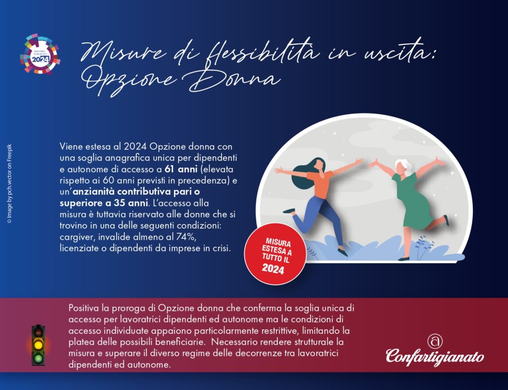 Opzione Donna viene confermata con le restrizioni attuali (cioè solo caregivers, invalidi 74% e disoccupate) a condizione che siano raggiunti 61 anni (ora 60 anni) e 35 anni di contributi al 31 dicembre 2023. Restano le riduzioni di un anno del requisito contributivo per ogni figlio fino ad un massimo di due anni e le finestre mobili di 12 mesi per le dipendenti e 18 mesi per le autonome.
