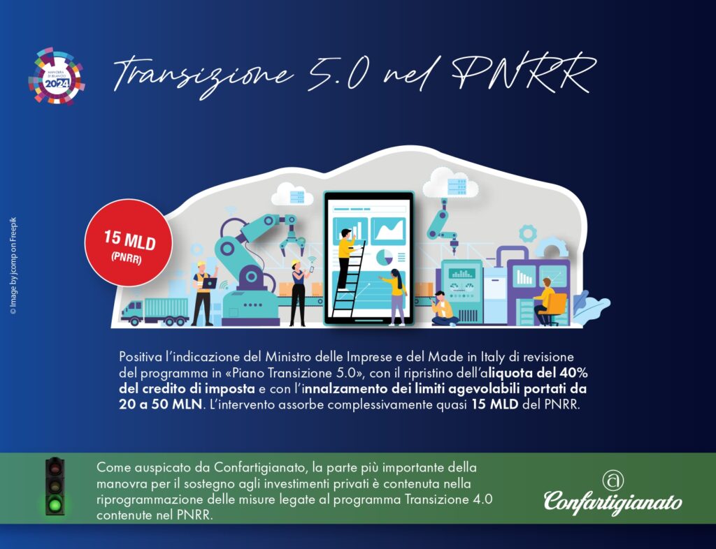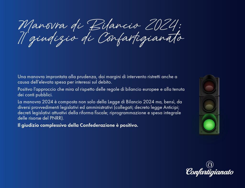 La Legge di bilancio 2024 contiene molte misure d’interesse per gli artigiani e le piccole imprese. Sono il risultato dell’azione di rappresentanza e delle battaglie condotte in questi mesi da Confartigianato per sostenere gli imprenditori ed accompagnarli in un percorso di sviluppo.