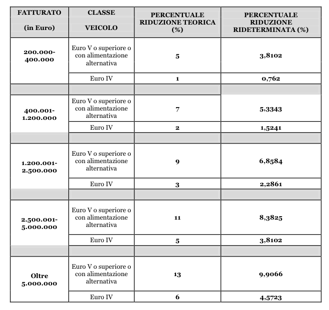 Di seguito, quindi, la tabella con le percentuali effettive di sconto spettanti alle imprese, in base allo scaglione di fatturato annuo realizzato ed alla classe del veicolo con cui sono stati effettuati i pedaggi autostradali: