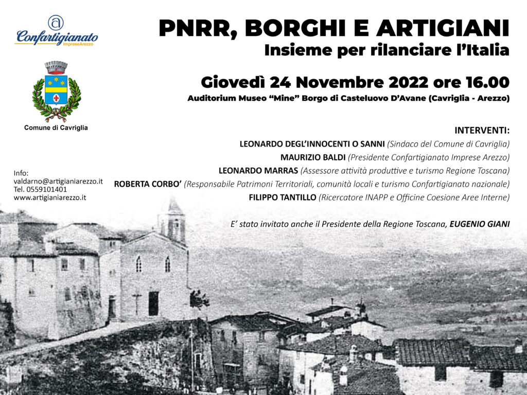 Da qui il Convegno promosso da Confartigianato Imprese Arezzo e dal Comune di Cavriglia dal titolo “PNRR, Borghi e Artigiani: insieme per rilanciare l’Italia”, in programma Giovedì 24 Novembre alle ore 16.00.