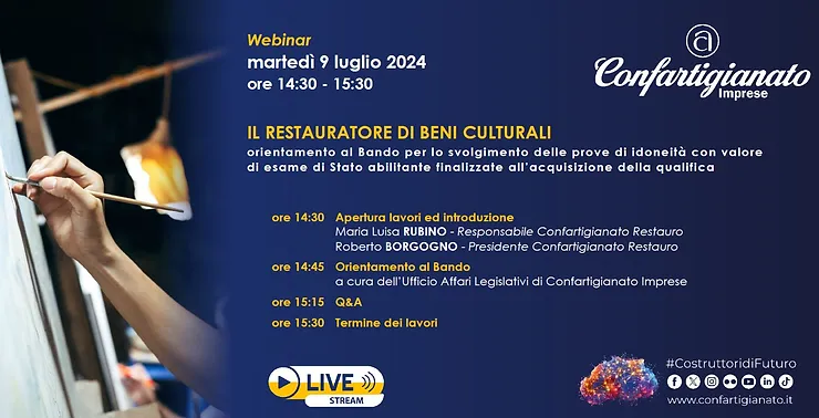 Al fine di supportare le aziende in questo percorso, Martedì 9 Luglio 2024 dalle ore 14.30 alle ore 15.30 Confartigianato promuove un webinar indirizzato alle imprese associate della categoria Restauro dal titolo “IL RESTAURATORE DI BENI CULTURALI. Orientamento al Bando per lo svolgimento delle prove di idoneità con valore di esame di Stato abilitante finalizzate all’acquisizione della qualifica”.