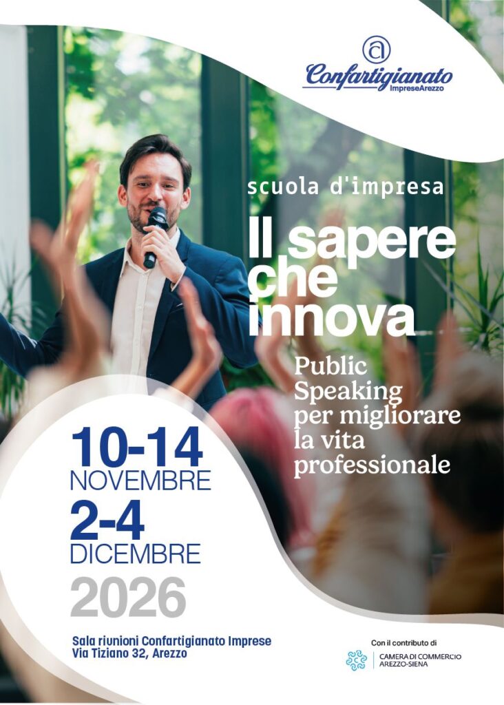 Questo percorso, realizzato anche grazie al contributo di Camera di Commercio Arezzo Siena, si inserisce a pieno titolo nel progetto “Scuola d’impresa: il Sapere che innova” e nasce per chi desidera alzare ulteriormente il livello: non parlare di più, ma parlare meglio, con presenza, autenticità e autorevolezza.