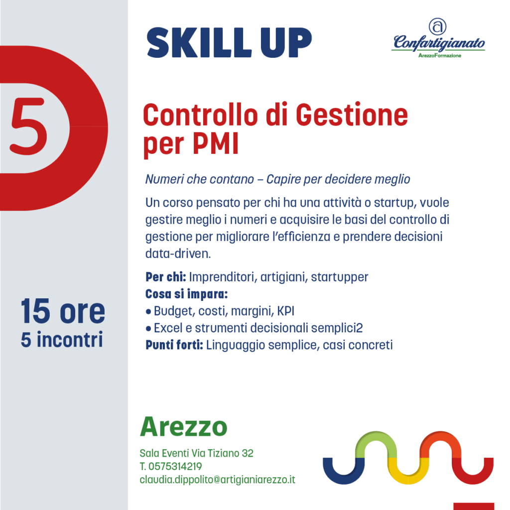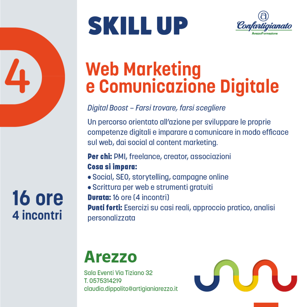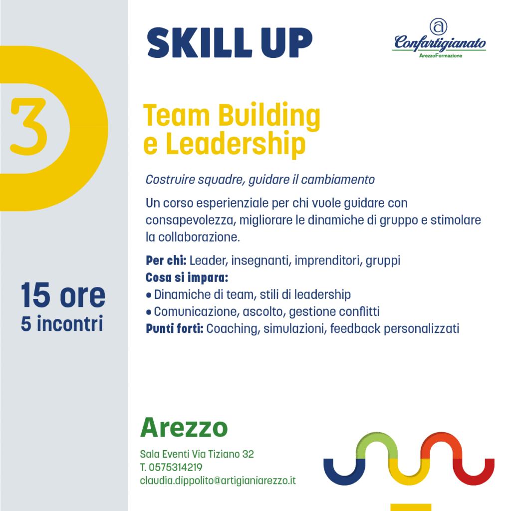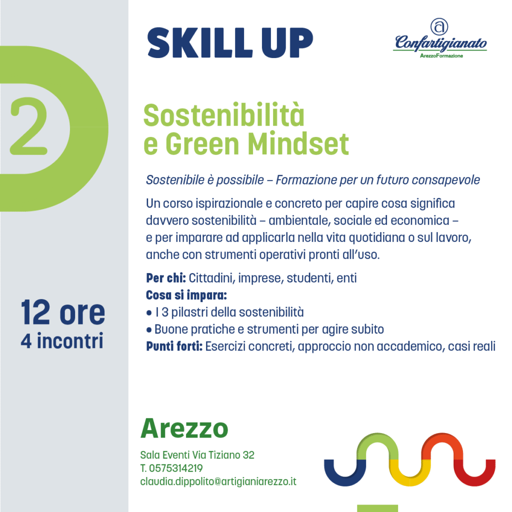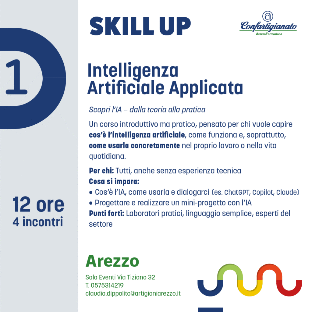 Con Skill Up, l’agenzia formativa Confartigianato Arezzo Formazione propone un’offerta formativa completa e trasversale: dalla padronanza delle tecnologie digitali all’attenzione per la sostenibilità, dalla crescita personale e relazionale alla gestione consapevole dell’impresa.