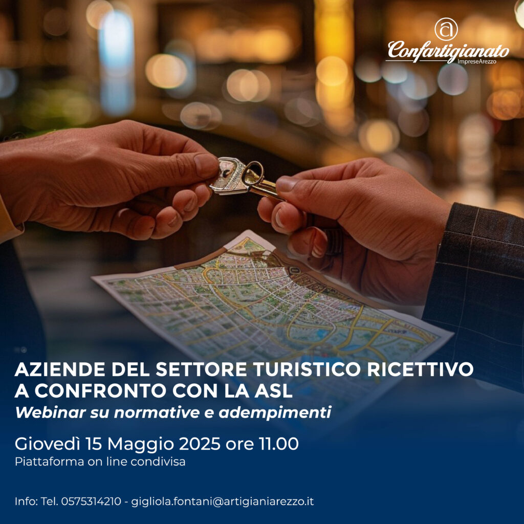 Il settore turistico-ricettivo è tenuto a rispettare una serie di norme e adempimenti complessi e articolati. Per fare chiarezza sul tema l’associazione provinciale Confartigianato Turismo ha organizzato un webinar Giovedì 15 Maggio 2025 alle ore 11.00 che vede la partecipazione della ASL Toscana Sud Est.