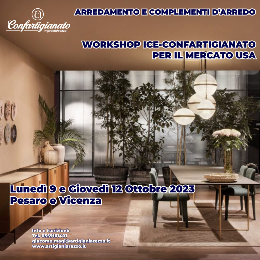 Confartigianato ed ICE Agenzia, organizzano nelle giornate di Lunedì 9 e Giovedì 12 Ottobre 2023, due workshop dedicati al mercato USA dei settore arredo, complemento di arredo, illuminazione e tessile casa.