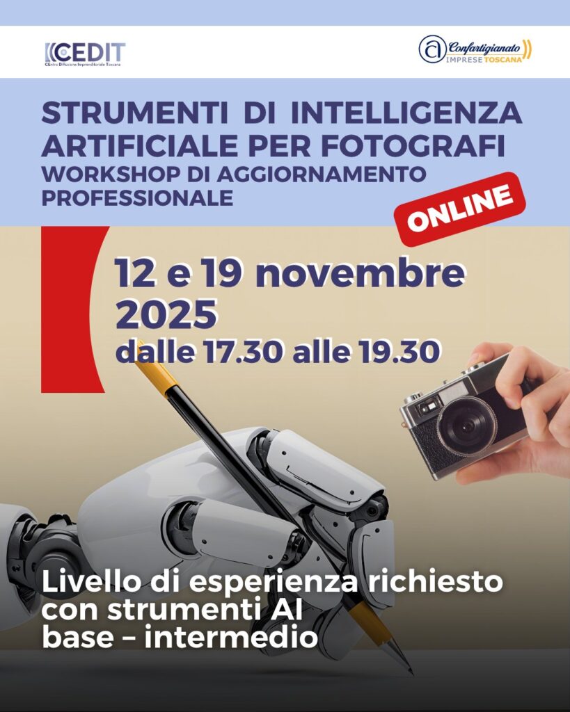Per questo motivo Confartigianato Fotografi Toscana, attraverso l’Agenzia Formativa CEDIT, ha organizzato un workshop in 2 appuntamenti online dal titolo “Strumenti di Intelligenza Artificiale per Fotografi”.